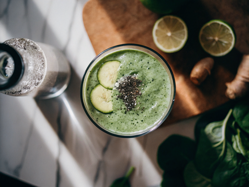 - Morning: Lemon water + Green smoothie