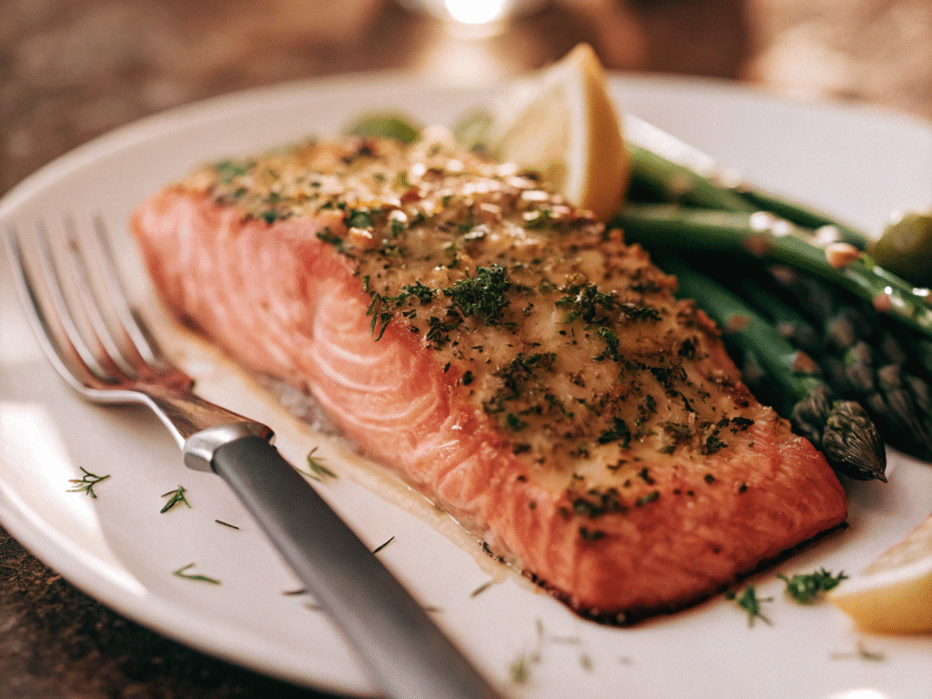 - Dinner: Herb-Crusted Salmon + steamed broccoli